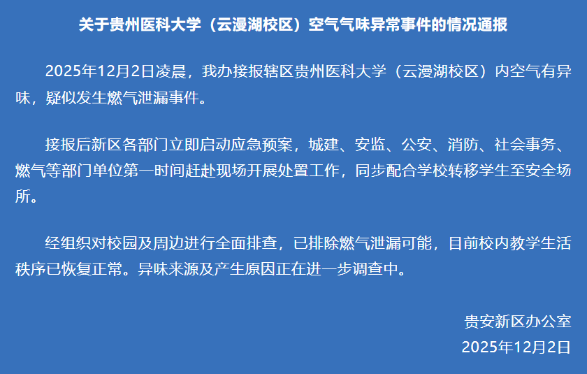 12月2日20时,贵安新区办公室发布《关于贵州医科大学(云漫湖校区)空气气味反常事情的情况通报》称,经安排对学校及周边做全面排查,已扫除燃气走漏或许。